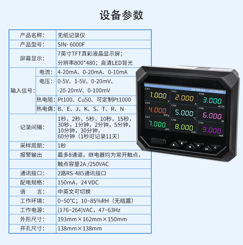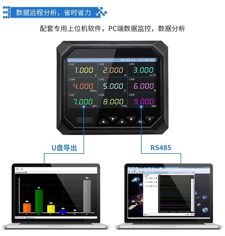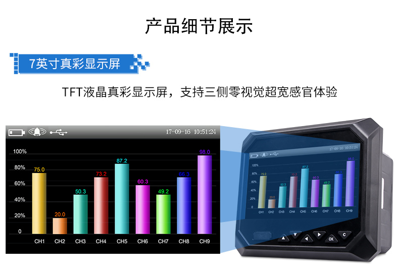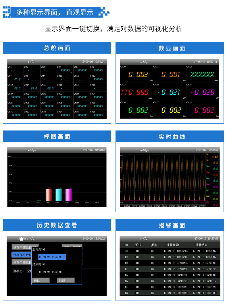 無紙記錄儀是將采集的數據/運算數據以時間為基軸記錄在儀器內部的存儲系統中,無消耗任何常用的記錄設施,如:紙張、筆墨。記錄在儀器內部的存儲數據,通過運算、模擬后顯示在液晶屏。常用顯示用液晶屏比較廣泛。在液晶屏屏幕上,可以顯示數字顯示、棒圖顯示、曲線顯示、報警列表等。無紙記錄儀采集的數據,常用的有:溫度、壓力、流量、液位、電壓、電流、濕度、頻率、振動、轉速等。