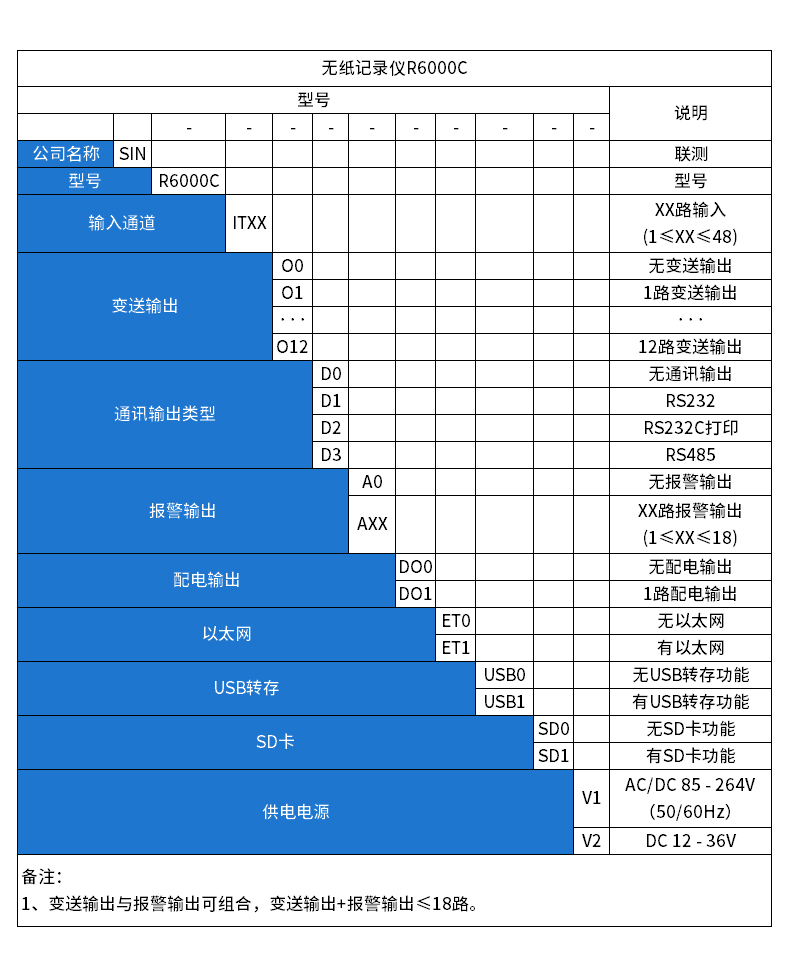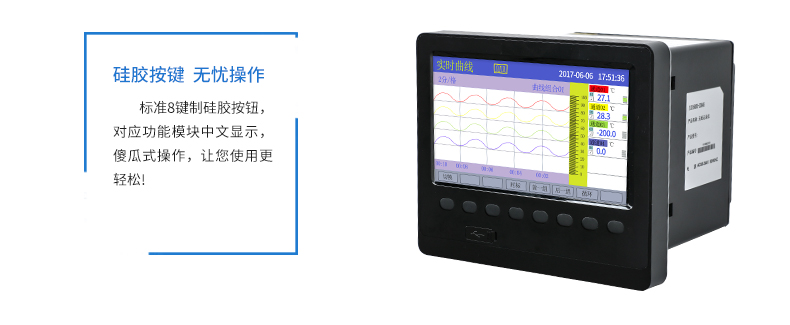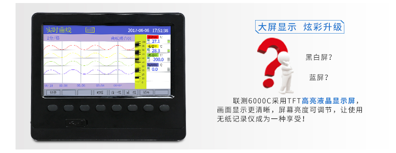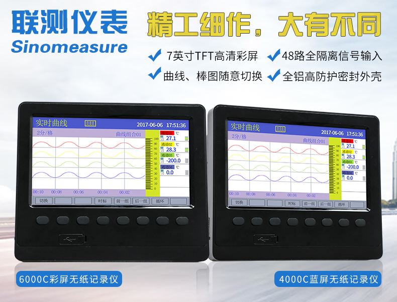 SIN-R6000C系列彩色無紙記錄儀48路萬能輸入(可組態選擇輸入:標準電壓、標準電流、熱電偶、熱電阻、頻率、毫伏等)。可帶18路報警輸出,12個變送輸出,RS232/485通訊接口,以太網接口,微型打印機接口和USB接口,SD卡插座;可提供傳感器配電;具有強大的顯示功能,實時曲線顯示,歷史曲線追憶,棒圖顯示,報警列表顯示。